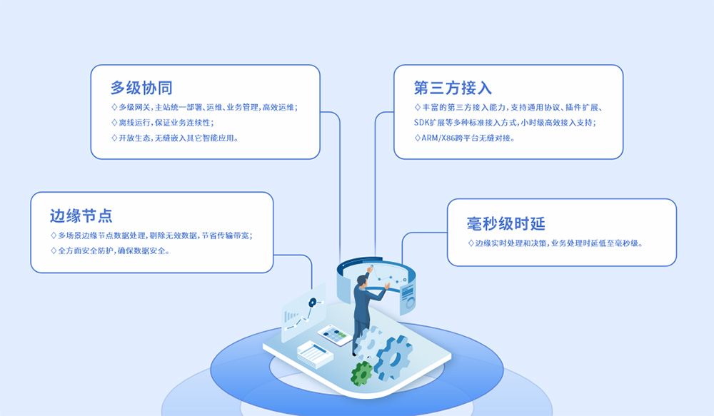 多級協同:多級網關,主站統一部署、運維、業務管理,高效運維;離線運行,保證業務連續性;開放生態,無縫嵌入其它智能應用。